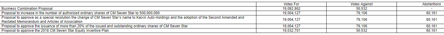 中民七星收购公司(CM Seven Star Acquisition Corporation)近期公布年度股东大会结果,股权交换协议拟进行的交易将于2019年4月30日完成。