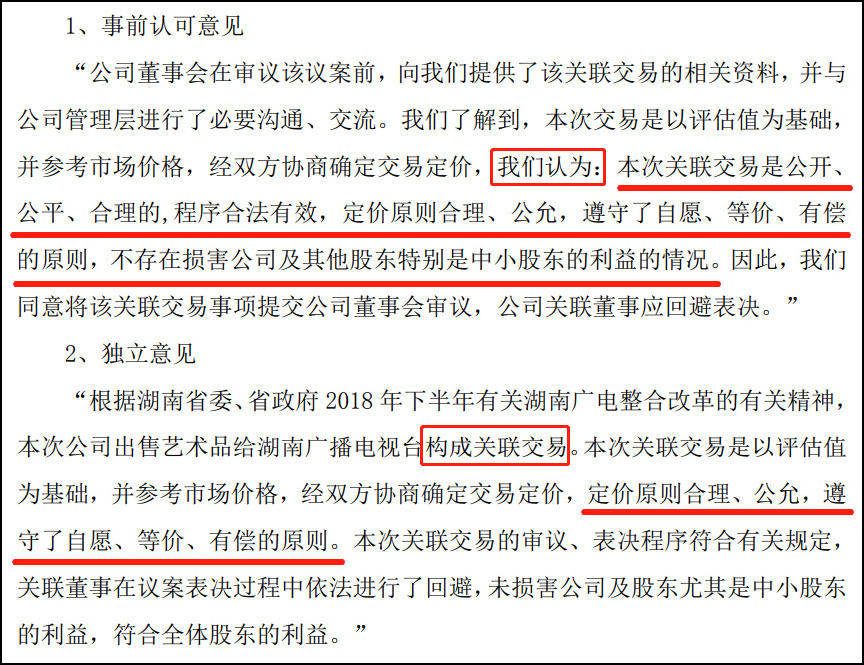 之后,北京中企华资产评估有限责任公司对油画价值进行了评估,评估基准日为2018年11月10日,评估价值2亿元。 最后,经双方同意,《愚公移山》价格敲定在2.088亿元(含税),价款分别在协议生效5个工作日内、画作交付5个工作日内,分两期付清。 值得一提的是,如果交易顺利,两笔款项最快可在两周内完成,恰好在年底前的周五(12月28日)。 公告称:“本次关联交易是以评估值为基础,并参考市场价格,经双方协商确定交易定价,定价原则合理、公允,遵守了自愿、等价、有偿的原则。” 外界纷纷指出,此次电广传媒“踩点”卖画给“亲戚”,是为了避免股票被“ST”。