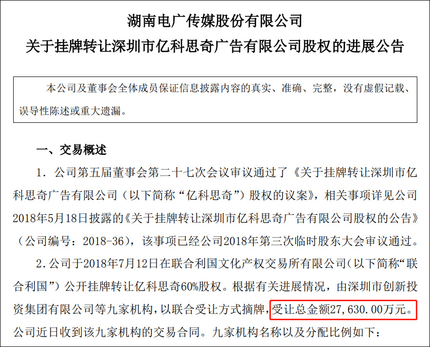 除了卖画,这家公司最近还转让了旗下控股子公司的股权:2018年7月12日,电广传媒在联合利国文化产权交易所有限公司,公开挂牌转让亿科思奇60%股权。 据11月27日公告,深圳市创新投资集团有限公司等九家机构以联合受让方式摘牌,受让总金额2.763亿元。 观察者网梳理发现,除有线电视网络及信息传播服务、广告制作代理、影视节目制作发行等主营业务外,电广传媒还从事艺术品投资管理。 7月24日,大公国际资信评估有限公司(下称:大公国际)发布《电广传媒2018年度跟踪评级报告》(下称:《跟踪报告》)称,采用成本法计算,截至2017年末,电广传媒持有的经营性艺术品账面价值为10亿元。 其艺术品投资以中国近现代大师的作品为重点,投资并收藏了齐白石、徐悲鸿、张大千等艺术大师作品以及瓷杂、家具等重器。