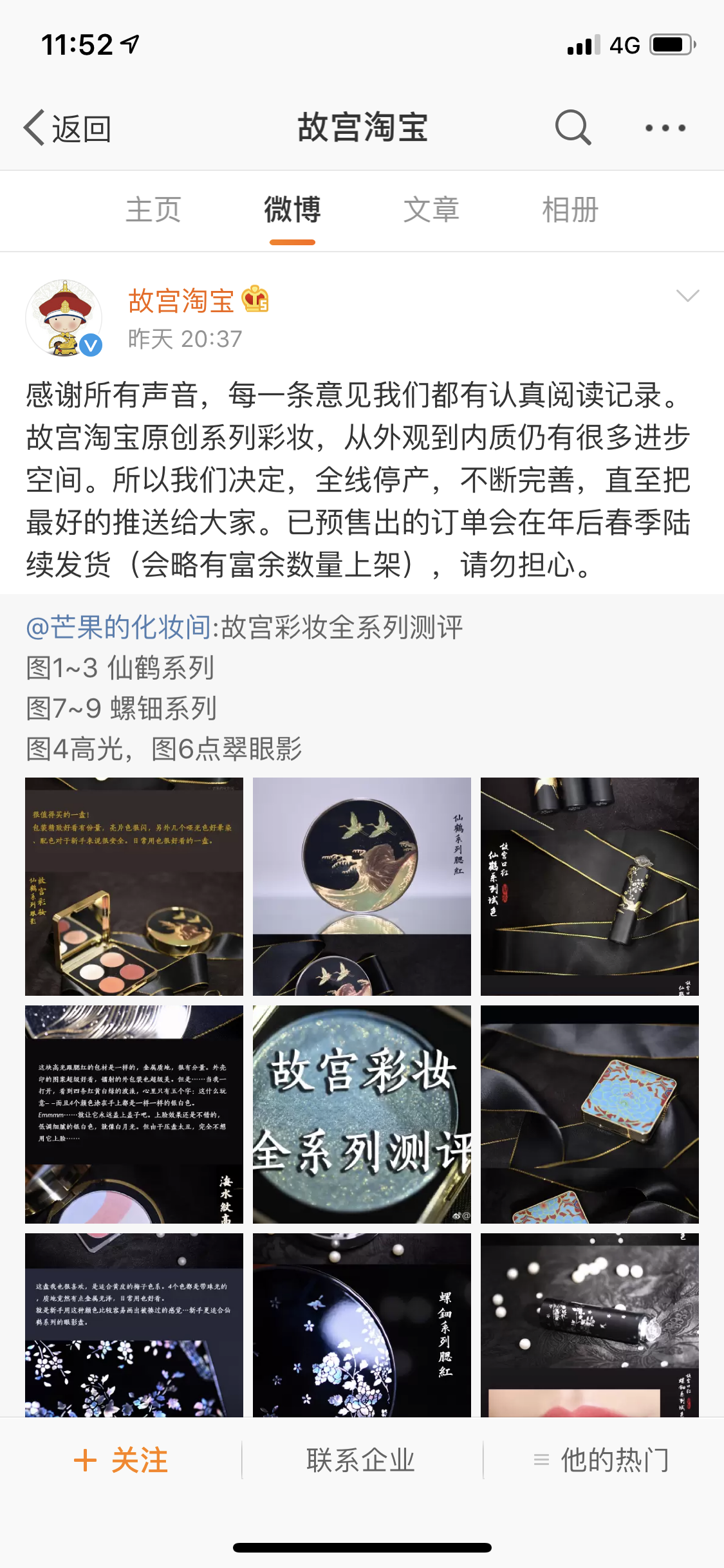 颜色不日常、眼影飞粉、腮红压盘有瑕疵……“故宫彩妆扛起国产彩妆大旗”的一片欢呼声还未落下,1月5日晚间,@故宫淘宝宣布,故宫淘宝系列彩妆全线停产,而这距离产品推出还不足1个月。 官微公布的下架原因为“口红外观反馈不够份量高级,膏体顺滑流畅度和颜色都有进步空间。眼影珠光颗粒不够精细,部分颜色有飞粉现象。腮红粉色挑人,橙色尚可。点翠蓝色实用度欠佳。”同时官微还表示:膏体配方改良,非一朝一夕之事。以后重新上架后,“不涨价”。 “感谢所有声音,每一条意见我们都有认真阅读记录。故宫淘宝原创系列彩妆,从外观到内质仍有很多进步空间。所以我们决定,全线停产,不断完善,直至把最好的推送给大家。已预售出的订单会在年后春季陆续发货(会略有富余数量上架),请勿担心。”