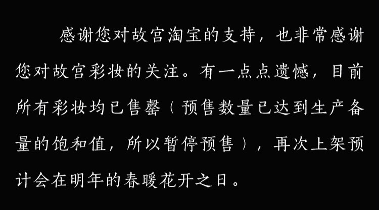 记者来到“故宫淘宝 来自故宫的礼物”的网店,点开分类,虽然“故宫彩妆”还位列分类第一位,但是点开后发现除了“相关说明”,分类下没有了产品。“相关说明”表示,所有彩妆将“暂别”再次上架“预计会在明年的春暖花开之日”。 官微一发声,立刻引起网友的一片惊愕:“为什么停产”的声音一浪高过一浪,对此,@故宫淘宝也作出回应:“口红外观反馈不够份量高级,膏体顺滑流畅度和颜色都有进步空间。眼影珠光颗粒不够精细,部分颜色有飞粉现象。腮红粉色挑人,橙色尚可。点翠蓝色实用度欠佳。”