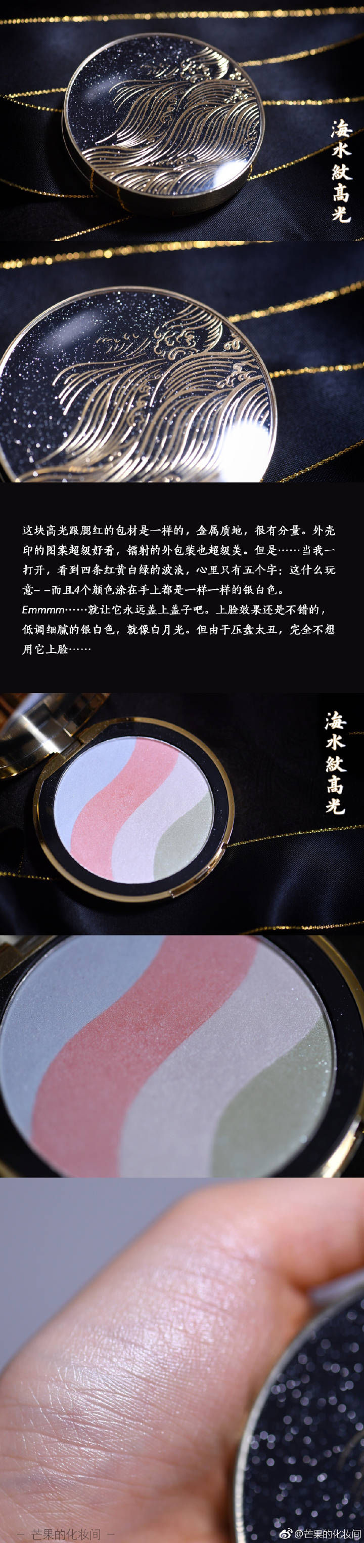 对于海水纹高光,@芒果的化妆间依旧对它的包装予以肯定:金属质地,很有分量,外壳图案好看。但是对于高光的颜色,“看到四条红黄白绿的波浪,心里只有五个字:这什么玩意——而且四个颜色涂在手上都是一样一样的银白色。”上脸的测评结果是:“还不错”、“就像白月光”,但由于压盘太丑,完全不想用它上脸。
